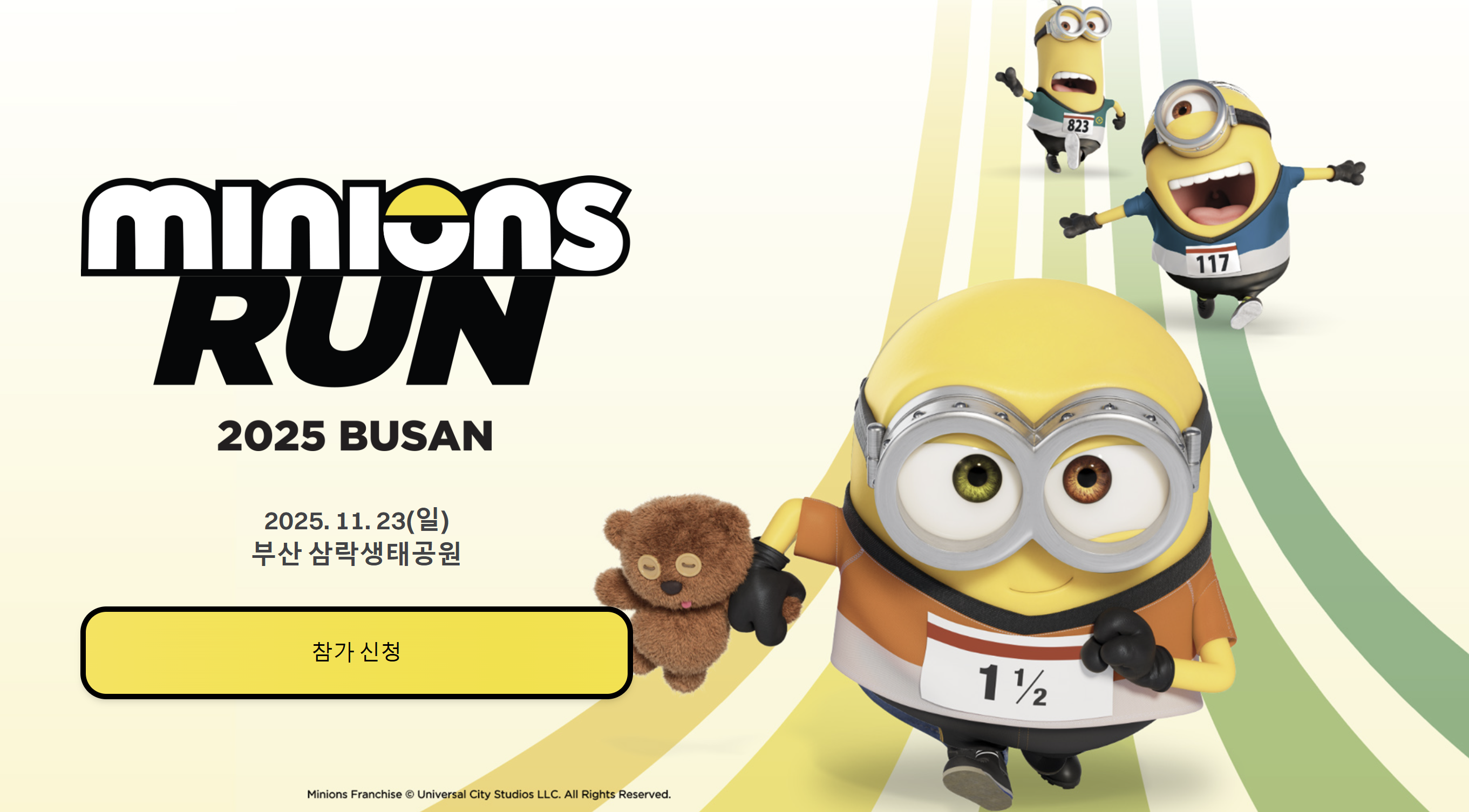 2025년 11월, 부산 사상구 삼락생태공원이 노란 미니언즈 군단으로 뒤덮인다. 7만 명이 몰린다는 소문은 과장이 아니다. 귀엽고, 시끌벅적하고, 중독적으로 행복한 그 행사, 미니언즈 런 2025 부산! 5km·10km 코스 선택부터 굿즈, 코스 팁까지—알고 가면 더 재밌는 정보만 쏙쏙 모았다.